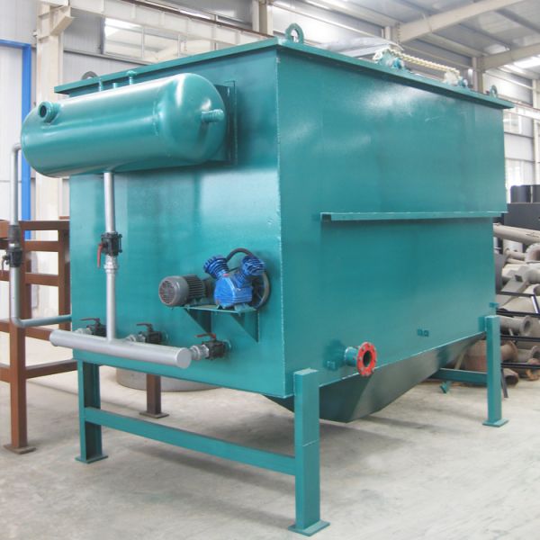 悬浮物被微气泡带到水面形成泡沫层,沿液面运动的刮泥机将泡沫刮到倾斜的金属板上,并将其推入污泥排放管道装有水平的螺旋推进器将所收集的污泥送入污泥收集起,推进器和刮泥机有同一个电机拖动,动力消耗很小,净化后的污水经斜板下方的溢流板进入排放管道,管道中装有液位控制器,来调节槽体内的水位,确保污水不流入污泥排放管道。而一些比重比较大的悬浮物则下沉到设备底部,经沉淀锥体浓缩后,定期有阀门排出机体外。